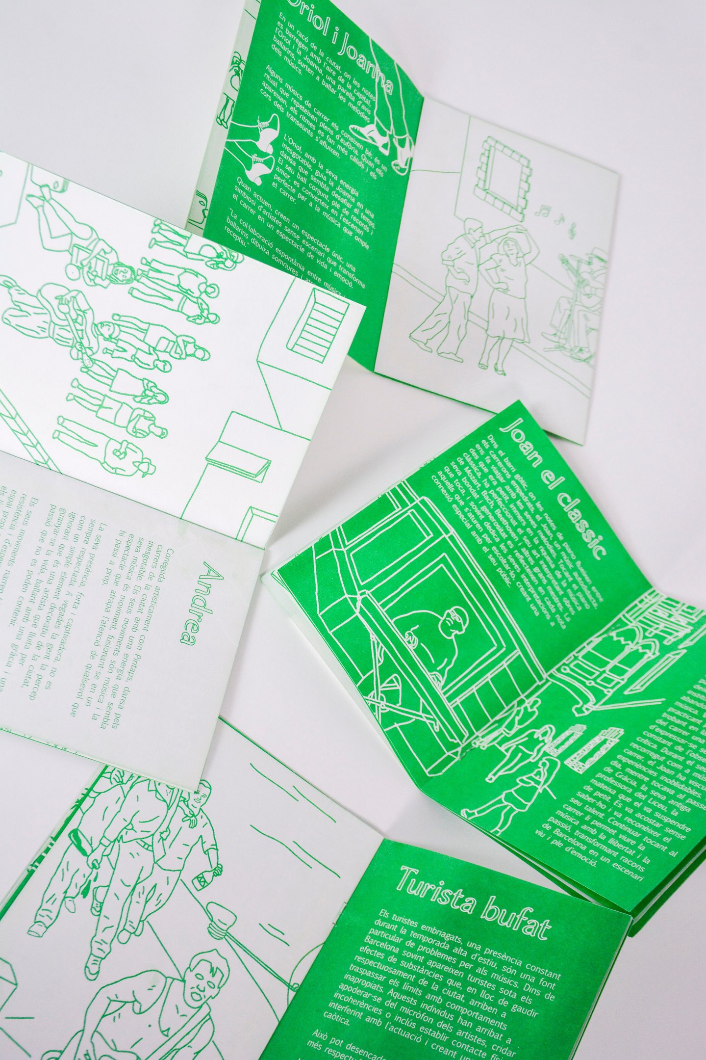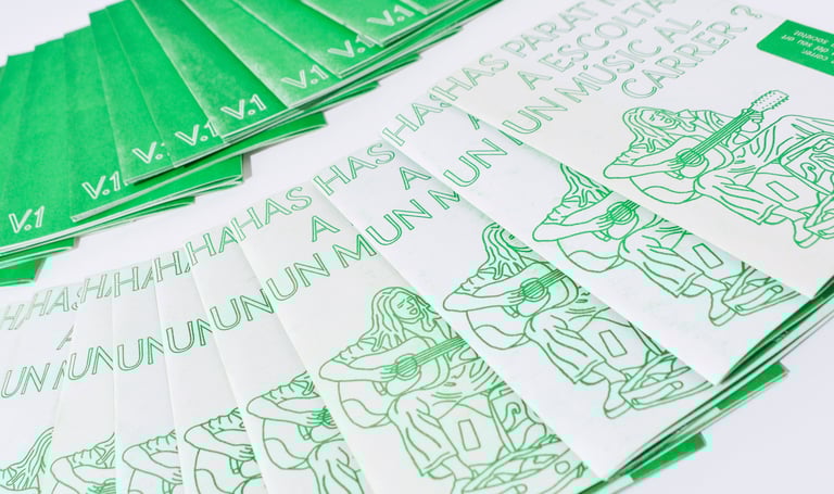 Fanzine inspired by real stories of street musicians, handling the entire process from illustration to graphic design. The project was printed using risography, emphasizing its raw, handmade character. Through this work, I explored narrative, visual identity, and experimental print techniques.